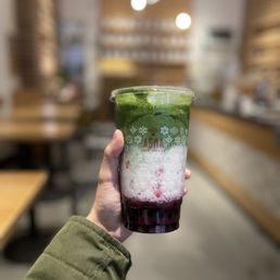 looks pretty but it was soo milky I could barely taste the matcha :( the strawberry puree was nice but got kind of lost once mixed in. I like the vibes of the cafe though